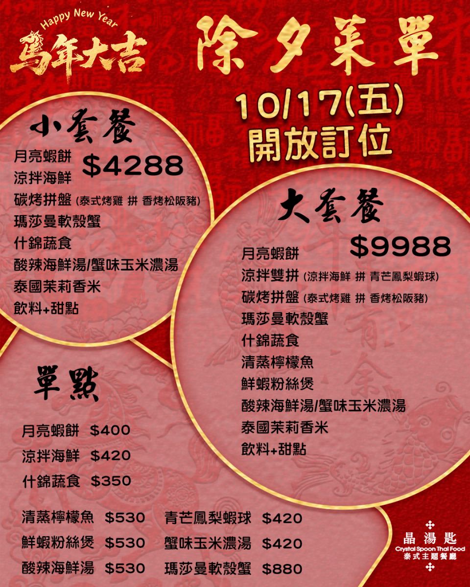 關於共同 味覺饗宴 最新訊息 分店位置 線上訂位 聯絡我們 2026【除夕團圓餐】 2025【您生日‧ 我招待】 最新訊息 選單 2026【除夕團圓餐】 2025【您生日‧ 我招待】 首頁 最新訊息 2026【除夕團圓餐】 2025-10-172026【除夕團圓餐】 優惠期間:2025/10/17起除夕套餐適用品牌 晶湯匙 (京站店、SOGO店、京站小碧潭店) 【2025/10/17】開放訂位,點開查看活動詳情 ※用餐時間90分鐘 ※本餐廳保留活動最終解釋權 ※本活動不得與其他優惠專案合併使用 ※本餐廳禁帶外食,需酌收原價10%清潔費 ※本餐廳牛肉肉品來源為美國、澳洲及紐西蘭; 豬肉肉品來源為台灣 ※本活動供應時間除夕當日全天,其餘時間暫無供應 ※本餐廳保留活動最終解釋權 回上一頁 Top